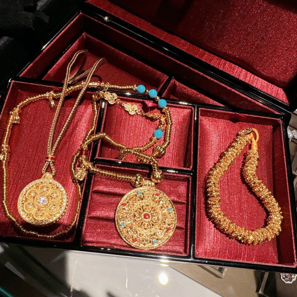 Ancient gold filigree carved rose window pendant necklace, new Chinese style wealthy woman hammer gourd compass necklace